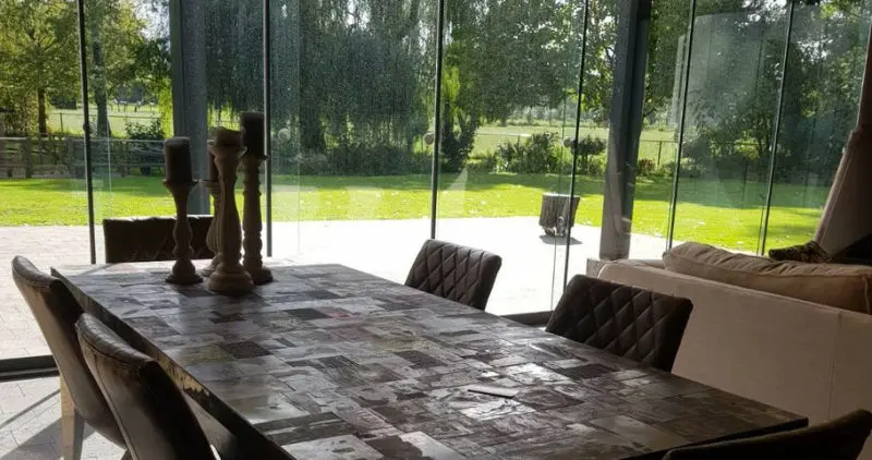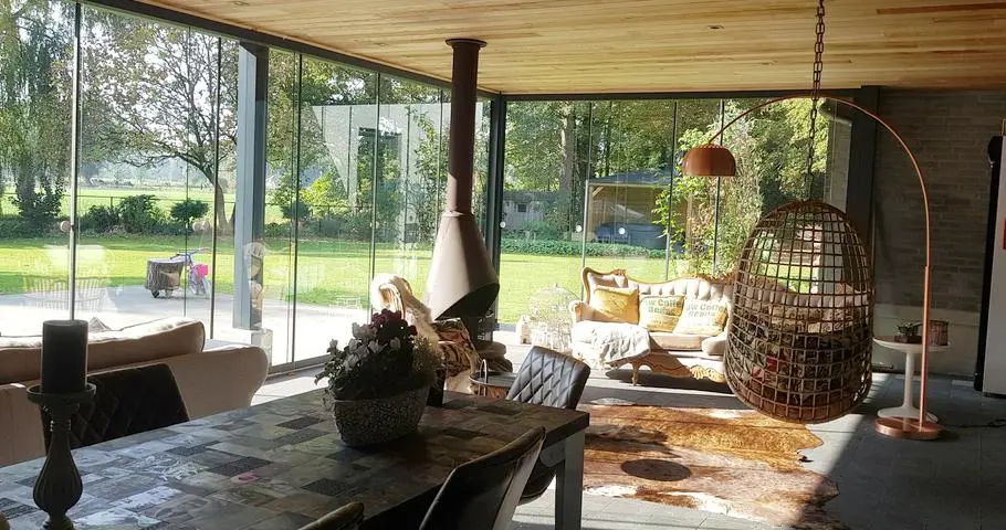 Overdekt tuinterras met afsluitbare glaswand zowel voor zomer als winter te gebruiken